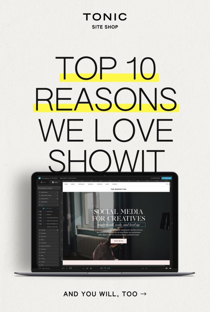 Our inbox is often flooded with questions about Showit — the platform itself, the functionality behind it, and what it can do for their website. We create designs exclusively for Showit — and with good reason. So in this post, we want to talk about why we love Showit (so much so that if TONIC was an actual person… it would be exclusively dating Showit). We like strong drinks and strong opinions so we’re really going to hit this home with 10 reasons why we love Showit. Here goes.