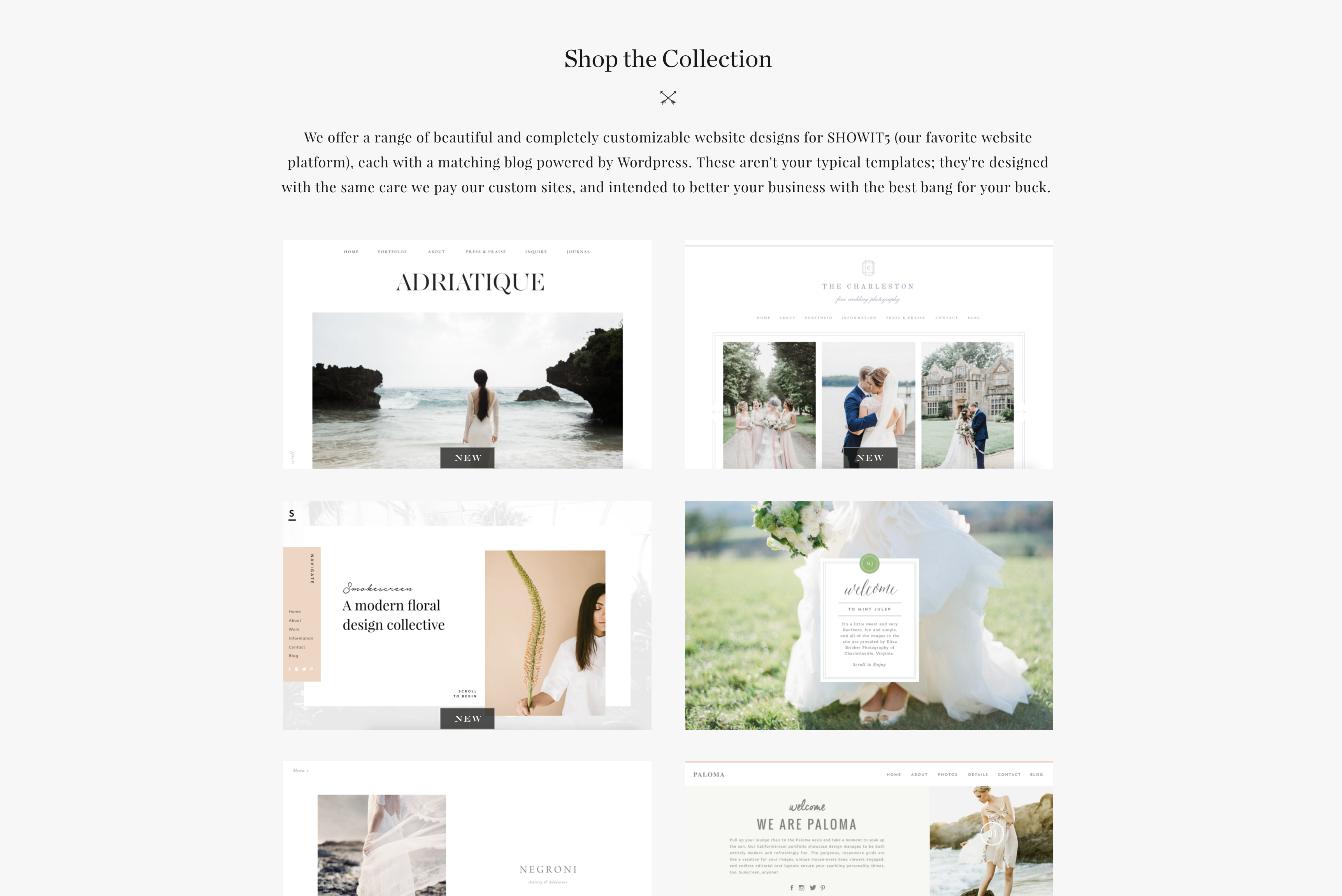If you’re looking for a custom design, find a designer with a portfolio of sites you vibe with and inquire with them — they typically book up fast! Or if you’d like something beautiful up and running ASAP, we’ve designed some beautiful SHOWIT templates over at on our collection page that we don’t think you’ll want to burn down… *wink*