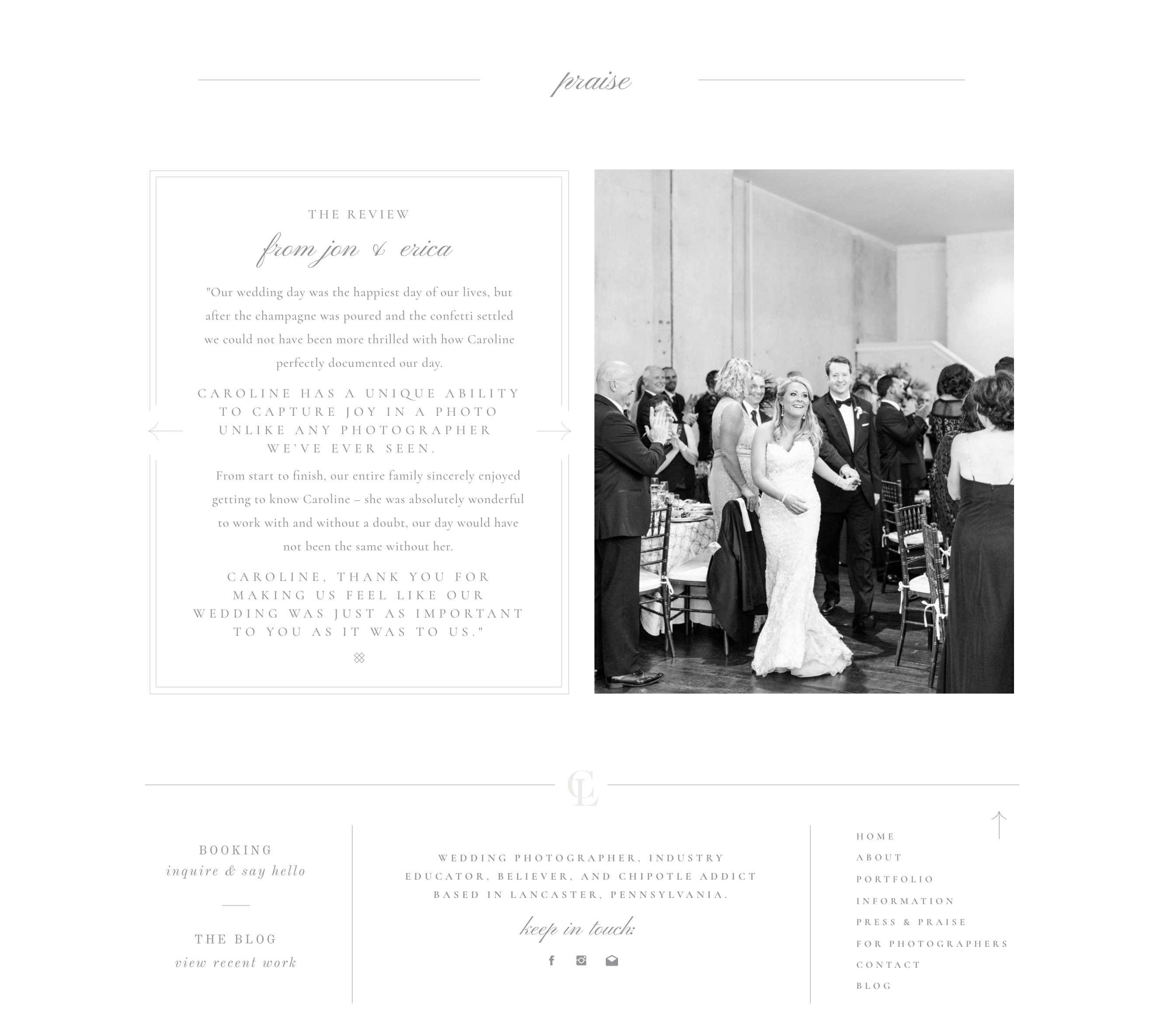 Exhibit C: Caroline Logan made use of the beautiful, ready-made reviews layout from our Charleston design to showcase kind words from her clients and even more signature images. This highlights what it’s like to work with her in THEIR own words. and there’s nothing sweeter than that when it comes to social proof. Can we get an “Amen”?!