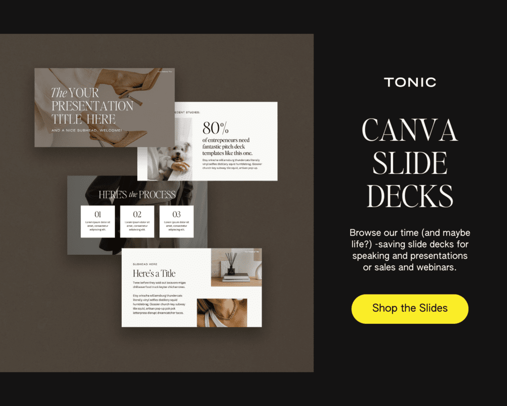 Whether you’re showing up on the main stage, at an online event, or just your Instagram stories, knowing how to present and speak with confidence can be a *superpower* for your business. (Especially because it’s most people’s kryptonite.) We take that pretty seriously as we got to work to design some pretty killer Canva Presentation Slide Deck templates to help you confidently share what you do and how you do it with others.