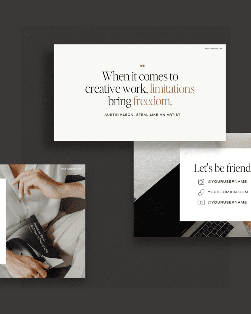Our Webinar + Sales Funnel Canva Slide Deck and our Speaking + Presentation Canva Slide Deck are both equipped 80+ slides, gorgeous typography and stock photos (all pre-licensed for your use!), and easy-to-use, plug-and-play designs that’ll save you hours upon hours of time.