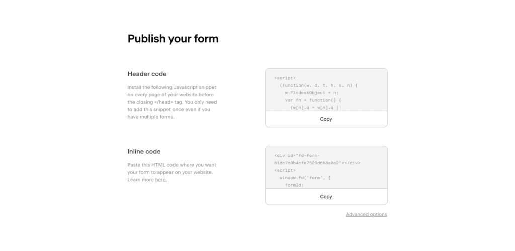 For inline forms, Flodesk will provide “Header code” and “Inline code”. You’ll need both code snippets to display your opt-in form.