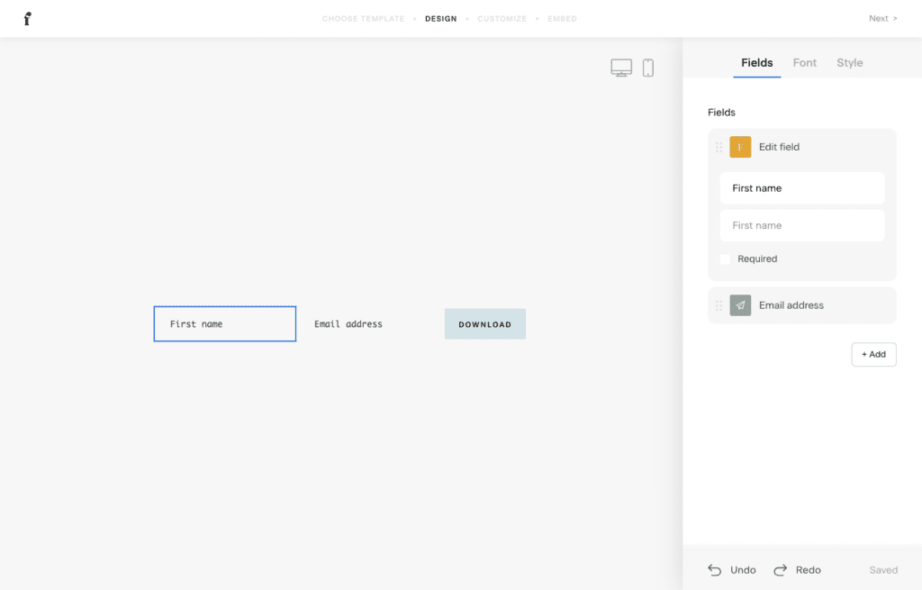When writing emails, you’ll want to add personal touches, like names, to your copy. To add form fields, select a field and click on “+ Add” button on the right.