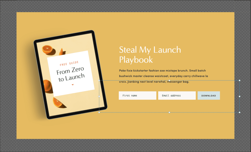 First, copy the “Header code” and head over to Showit. Add an “embed code” box to your newsletter or freebie page and resize the embed code box (it doesn’t have to be perfect, we’ll adjust it later)