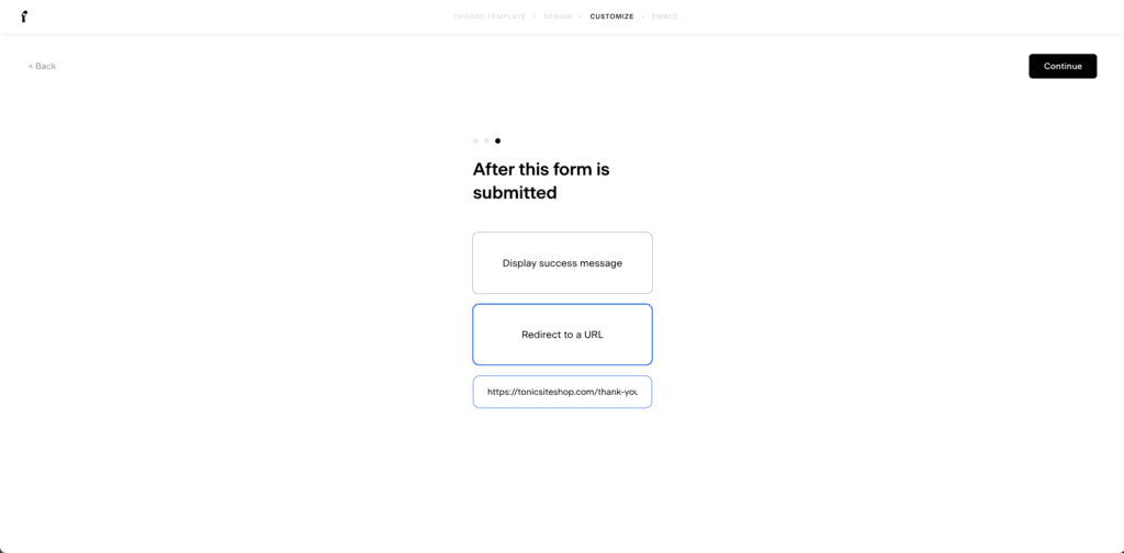 Click “Continue” until you see the “After this form is submitted” question and select Redirect to a URL.