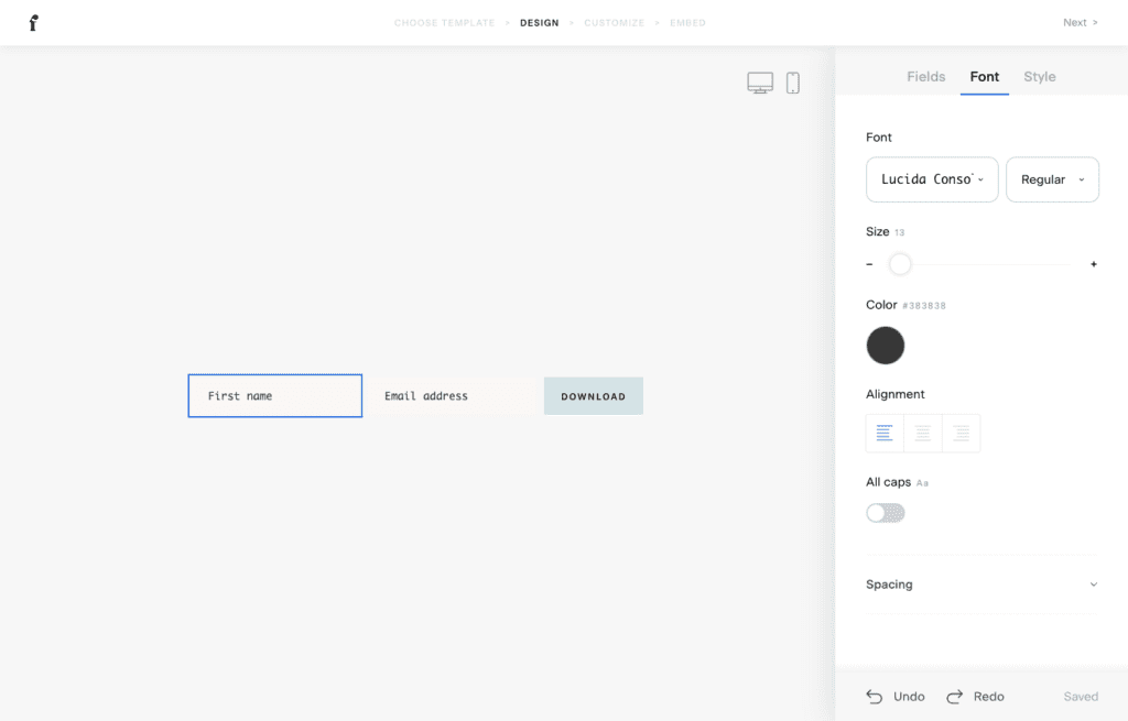 Select the “email address” field then select the “Font” tab on the right hand side. All of your font styles will be available here. Do the same for the “Subscribe” button.