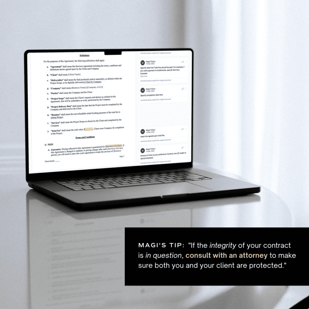 Finally, you might have a particularly savvy client who calls out inconsistencies, discrepancies or errors in your contract. If it’s something simple such as replacing their name with their company name, this shouldn’t be an issue. But if the integrity of your contract is in question, consult with an attorney to make sure both you and your client are protected.