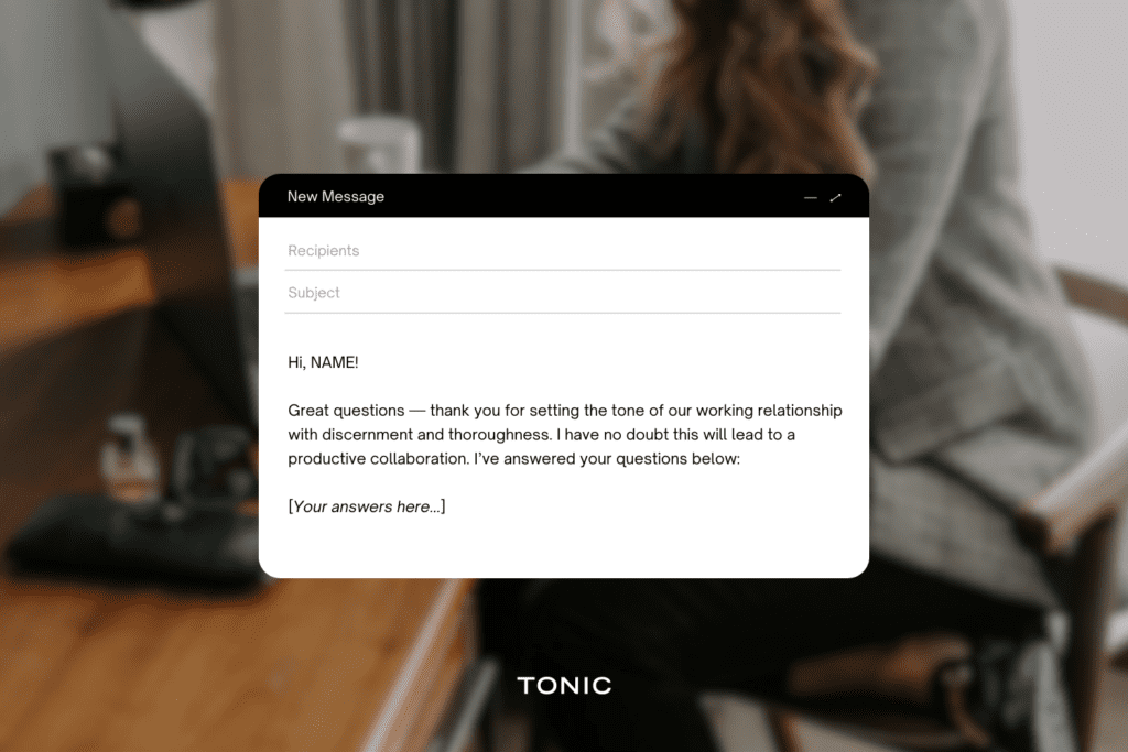 Sometimes their questions are focused on clarifying exactly what a clause says. In this case, you can simply answer using layman’s terms, and even give an example. I tend to have answers to the most common clarifying questions pre-written (with examples) and saved in a doc, so I can copy-paste when I need them. This might help you feel empowered (instead of stressed) when — not if — questions arise.
