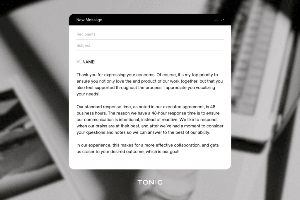 So, rather than take their frustration personally, leverage your contract (Pssst — this is only one reason why it’s super important to always have a contract! Read more about that here). If the project is underway, this means the contract has been executed. In other words, they agreed to the terms outlined in the agreement, which should include language protecting your process, for example, your response time, expectations, and style.