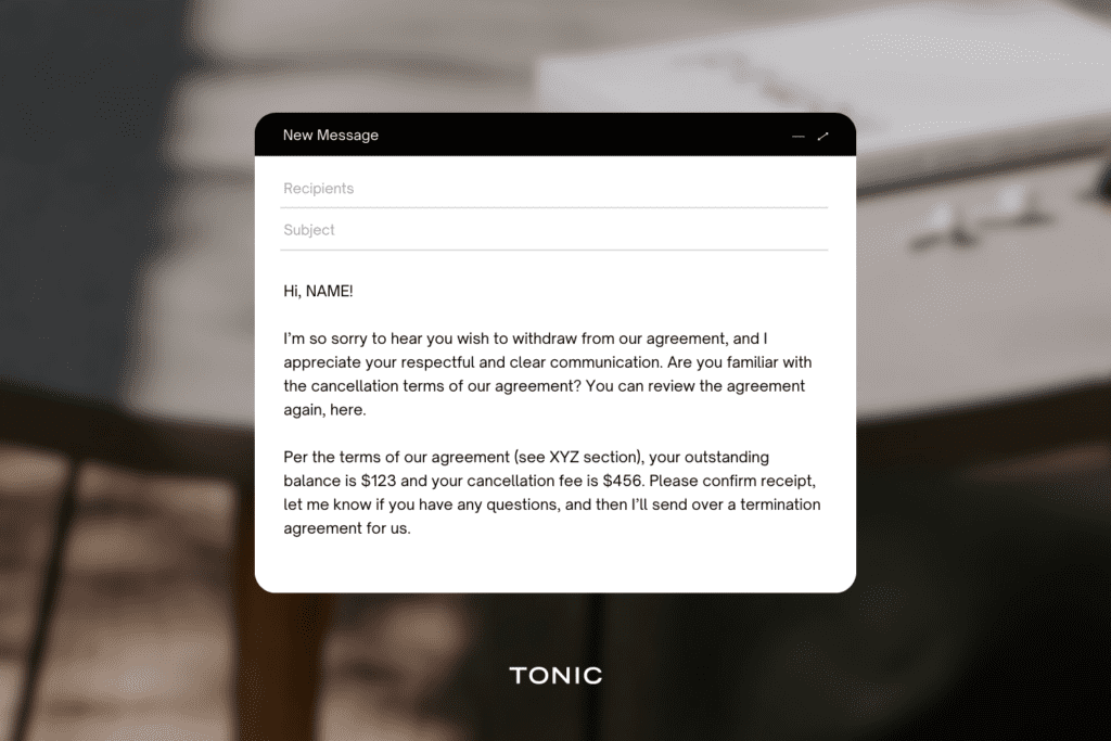 When a client gives written notice of withdrawal, your first response should be to confirm receipt of their note, clarify whether or not they are familiar with the contract termination terms in their agreement, and outline next steps in alignment with your cancellation terms.
