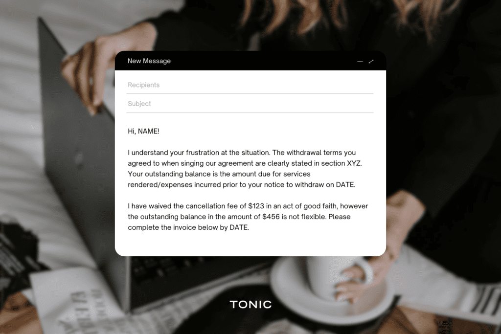 You might also be faced with some back and forth with the client, for example, if they have questions about the termination terms, or any push back. It’s not uncommon, especially if the client never read the agreement in the first place, for them to express frustration with your terms. The client may even start communicating unprofessionally, using language that includes “unfair” or “I don’t see why…” or perhaps flat out refusing to pay. The conversation might escalate to the point of needing to get your attorney involved. Sometimes, you can prevent this by referring back to the agreement.