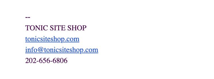 What do you want to include in your email signature? Typically, a photo of you (and/or your logo), your brand statement (to remind the reader of what you do and who you do it for), social links, contact info, a link to your beautiful TONIC website, and bonus — something you want people to DO. A link to a freebie, an opt-in, your blog, a place to submit reviews, maybe? It can be as simple or sexy as you want. Just get those things together. Here’s an example from our good pal Todd, CEO of SHOWIT. (Hi, Todd!)