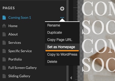 Click on the page name (ie. Coming Soon 1) and then click on the three dots (•••) next to the page name. Select “Set as Homepage”.