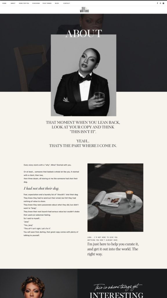 Really, your About section should be about your ideal client. What does that even mean? Hear us out. A lot of people spend all of their valuable About space telling the world how great they are – and that is part of it. But the most valuable thing you can do is connect with your audience by telling them how you can help, serve, and give THEM what they need and want. Try this: go through your copy and see how many times you say “I,” “me,” or “my.” Now find the places you say “you,” and “your.” Try to balance out that ratio. Kaitlyn at Copy Uncorked does this so, so well. Check out her About page that’s really all about her clients.