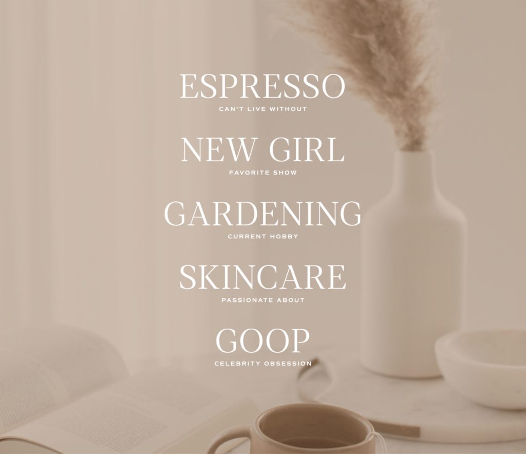 People love to feel like they are connecting with a real person – no matter how talented and professional you are. One super dynamic way you can do this is to relate to your audience. A “favorite things” section is a great way to share (go on…it’s ok to show your quirky, nerdy, or basic self). That’s what people love, and that’s what people can identify with. That’s what makes you real. Maybe you have a super specific pet peeve (like, you haaaate when people mis-pluralize their last name…or clapping at the end of a movie). Maybe you have a favorite product you can’t live without (hello Nespresso). Or maybe you have an embarrassing moment that led you to what was ultimately life-changing (like meeting your spouse or starting your business). These are the kind of details people love. So share them, friends!