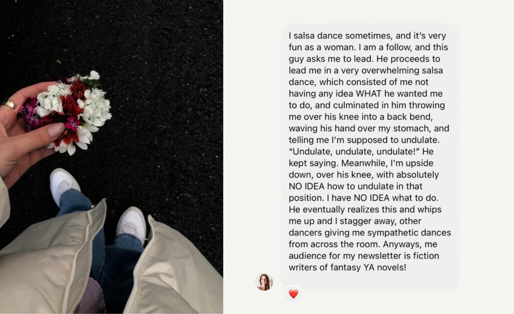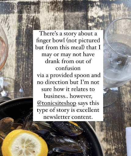 Running into former Etiquette teacher at an event and her asking me—at age 18—to spit my gum out into her hand? You better believe I was both dying of embarrassment and dying to tell our subscribers all about it. (That story is the perfect depiction of why I’ve chosen to officially title the TONIC newsletter #longandweird)