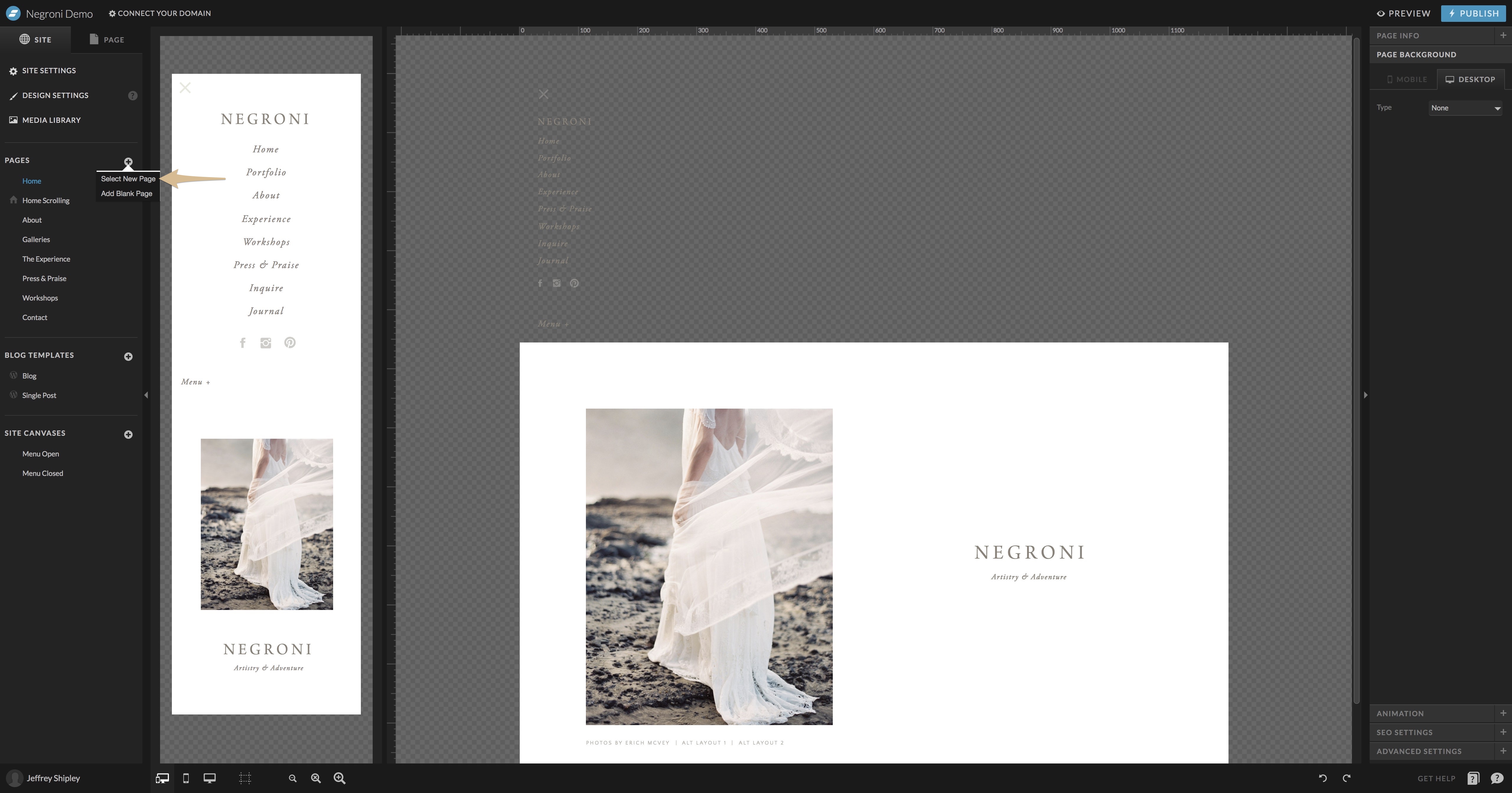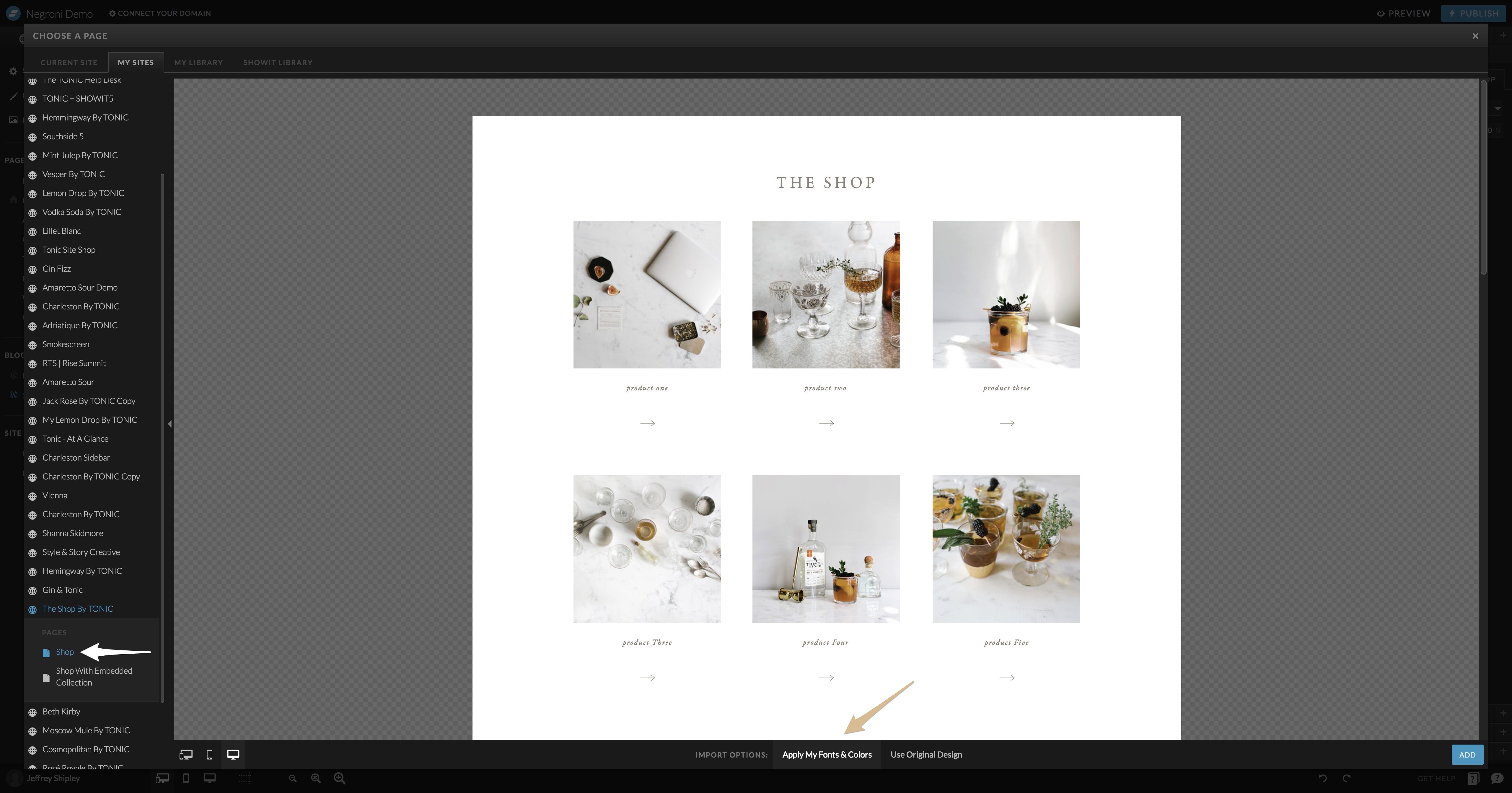 Then, to add the shop page to your existing site design, click the “+” button on page tab and select “add new page”, select the “Tonic Shop Add-On” template …