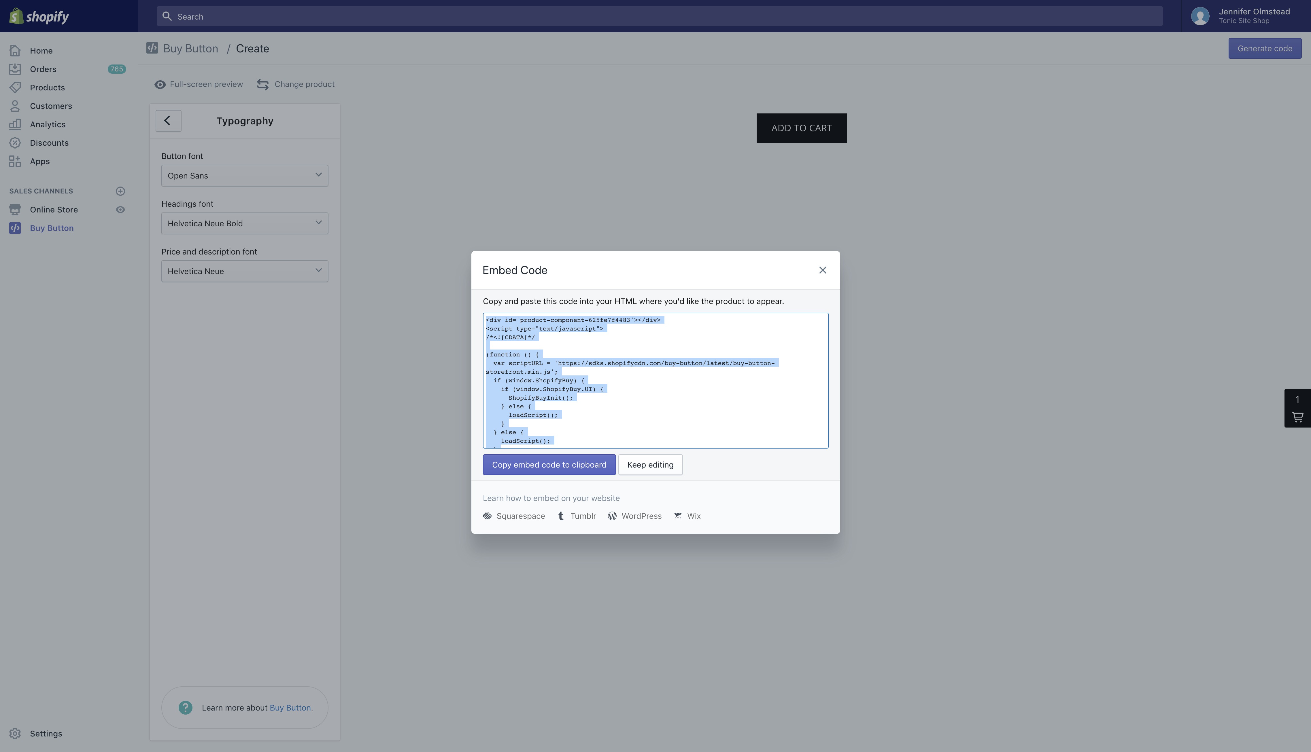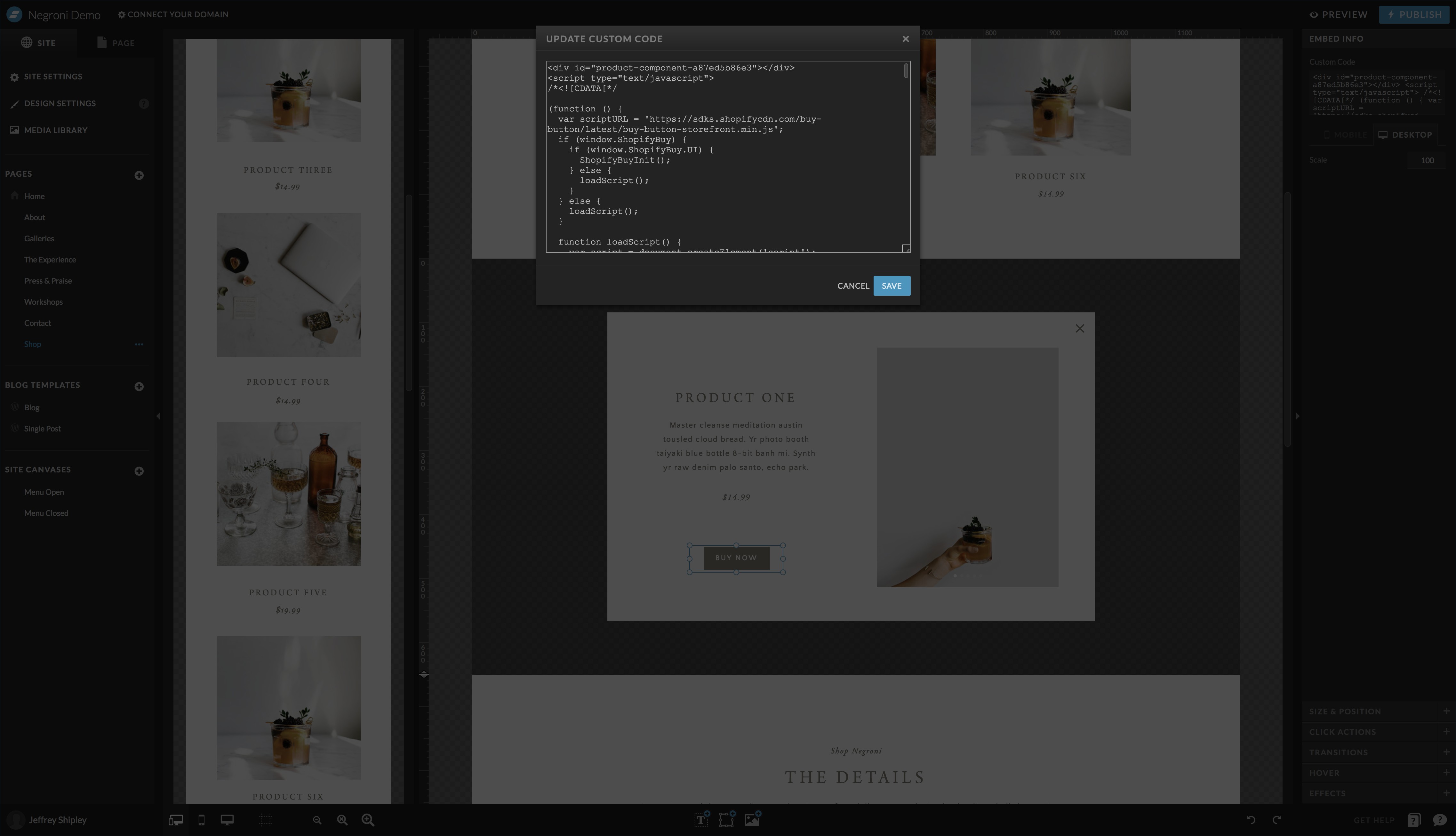 Finally, it’s time to add in the buy buttons. In Shopify, toggle over to sales channels, add a buy button sales channel, and then you’ll see that icon pop-up on your left-hand side. Click on buy buttons and then follow the prompts to set that up. You can stylize the buttons here if you wish, but since the options are a little limited and it would require lots of css code to customize it to match your site, we’ve found that it’s easiest to just bring the opacity down to 0% on the embed code layer and make pretty buttons inside of Showit instead. So just copy the code to your clipboard, and paste it into the already-set-up embed code layer in Showit which is on top of the buy button you see on the product page. Rinse and repeat for all products.