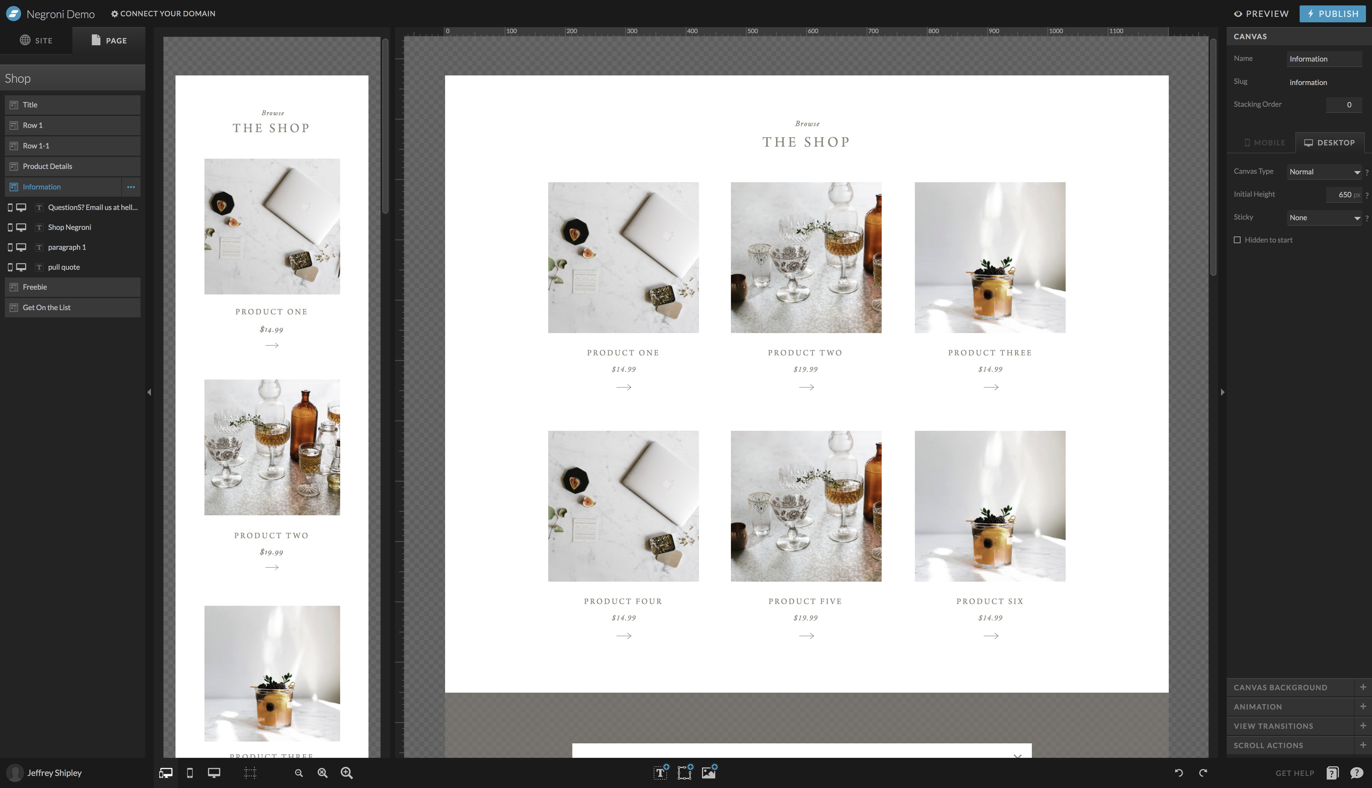Next, now that you got everything all prepped and ready, it’s time to add in your product images, product descriptions, and pricing info to the product details page and duplicate that page for each product you have. Then, you’ll want to build out the shop grid and ensure the buttons and images are linked the correlating product pages. We have three product per row set-up for you, so if you need more just duplicate that canvas and adjust the click action settings accordingly.