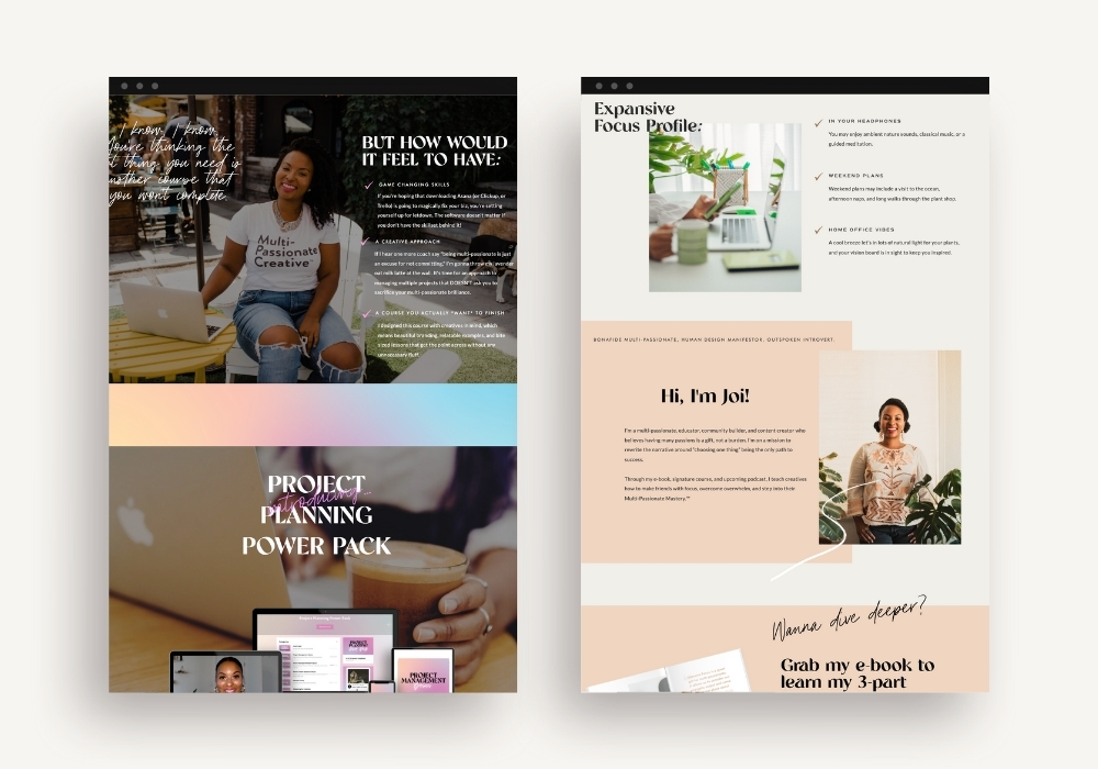 Use a piece of the design over and over or use the whole page for another purpose. We were SO impressed with how Joi of Joi Knows How used our sales page template for both her course and her quiz results page. She did such a good job, too, and you’d never know they were two versions of the same template.